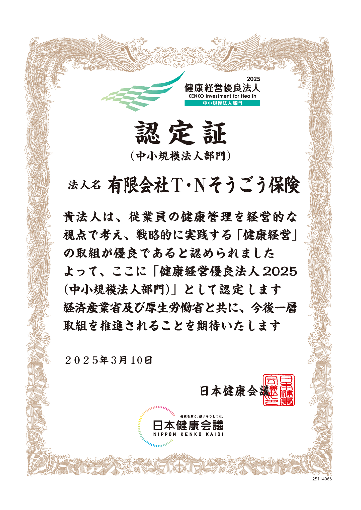 有限会社T・Nそうごう保険は、経済産業省と日本健康会議が進める健康経営優良法人認定制度において「健康経営優良法人2025(中小規模法人部門)」に認定されました。
